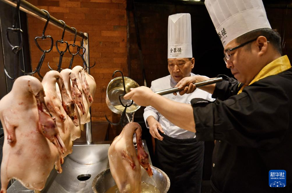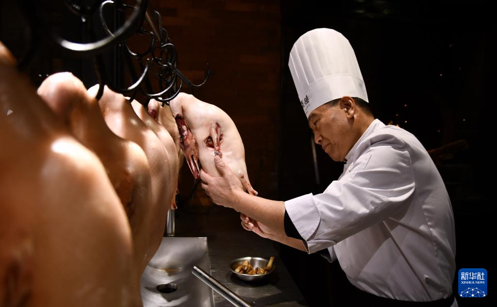 全聚德挂炉烤鸭第六代传承人、高级烹饪技师吴玉波在进行鸭坯烤制前的准备(3月13日摄)。