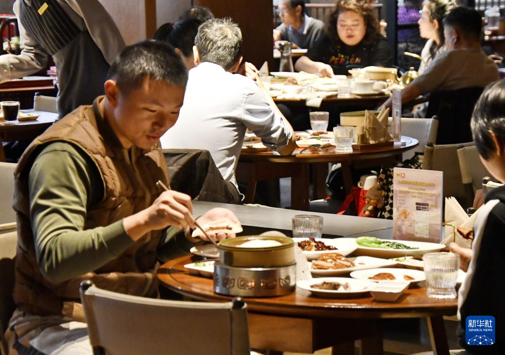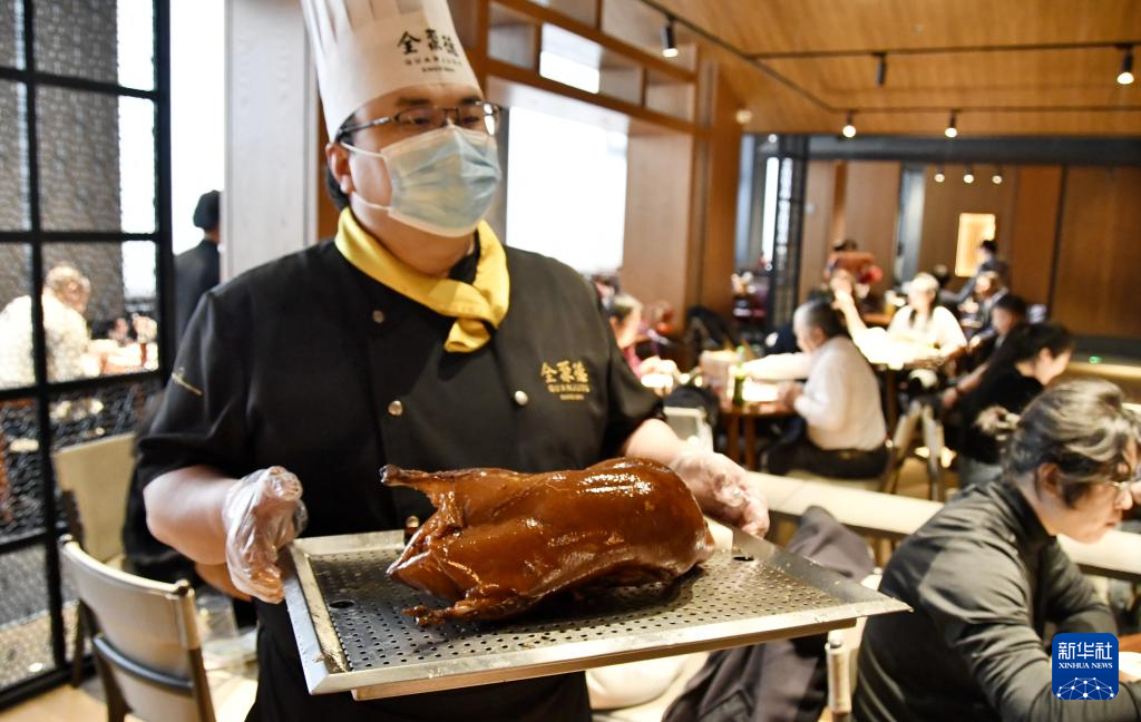 顾客在全聚德烤鸭店和平门总店品尝挂炉烤鸭(3月13日摄)。