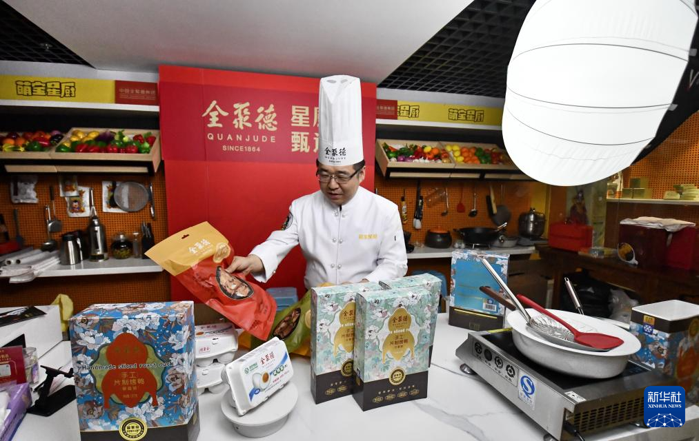 全聚德烤鸭店的年轻技师准备进行网络直播销售(3月13日摄)。