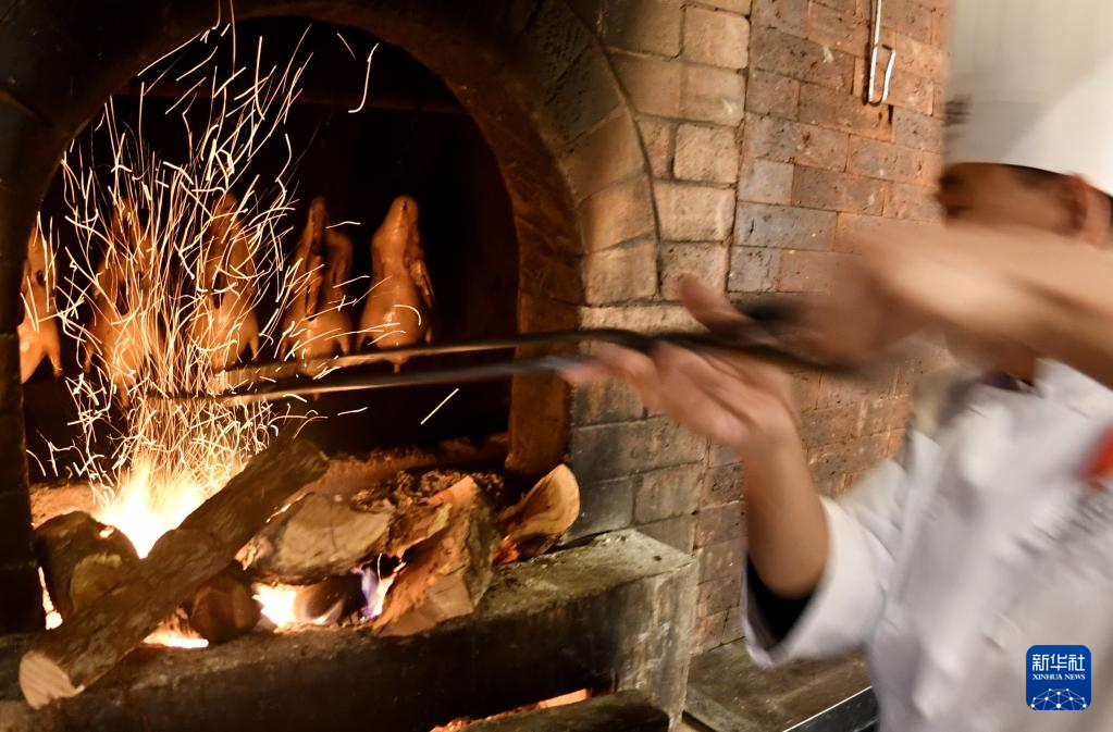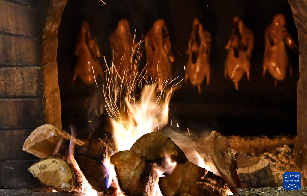 在全聚德烤鸭店和平门总店的传统挂炉中烤制的烤鸭(3月13日摄)。