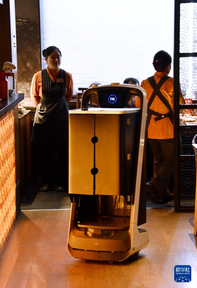 在全聚德烤鸭店和平门总店拍摄的送餐机器人(3月13日摄)。