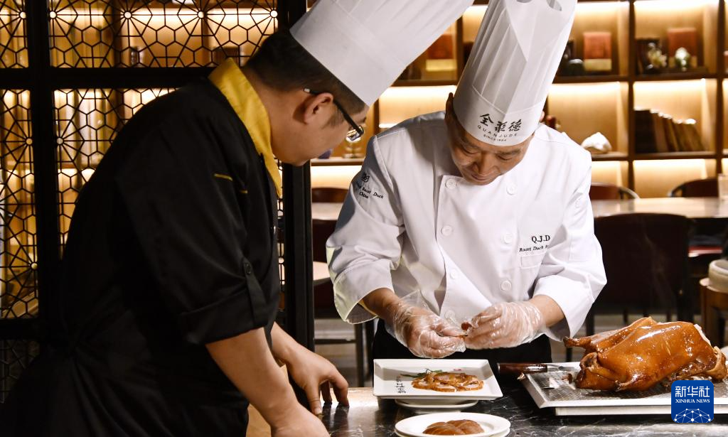 全聚德挂炉烤鸭第六代传承人、高级烹饪技师吴玉波(右)在为学生传授经验(3月13日摄)。