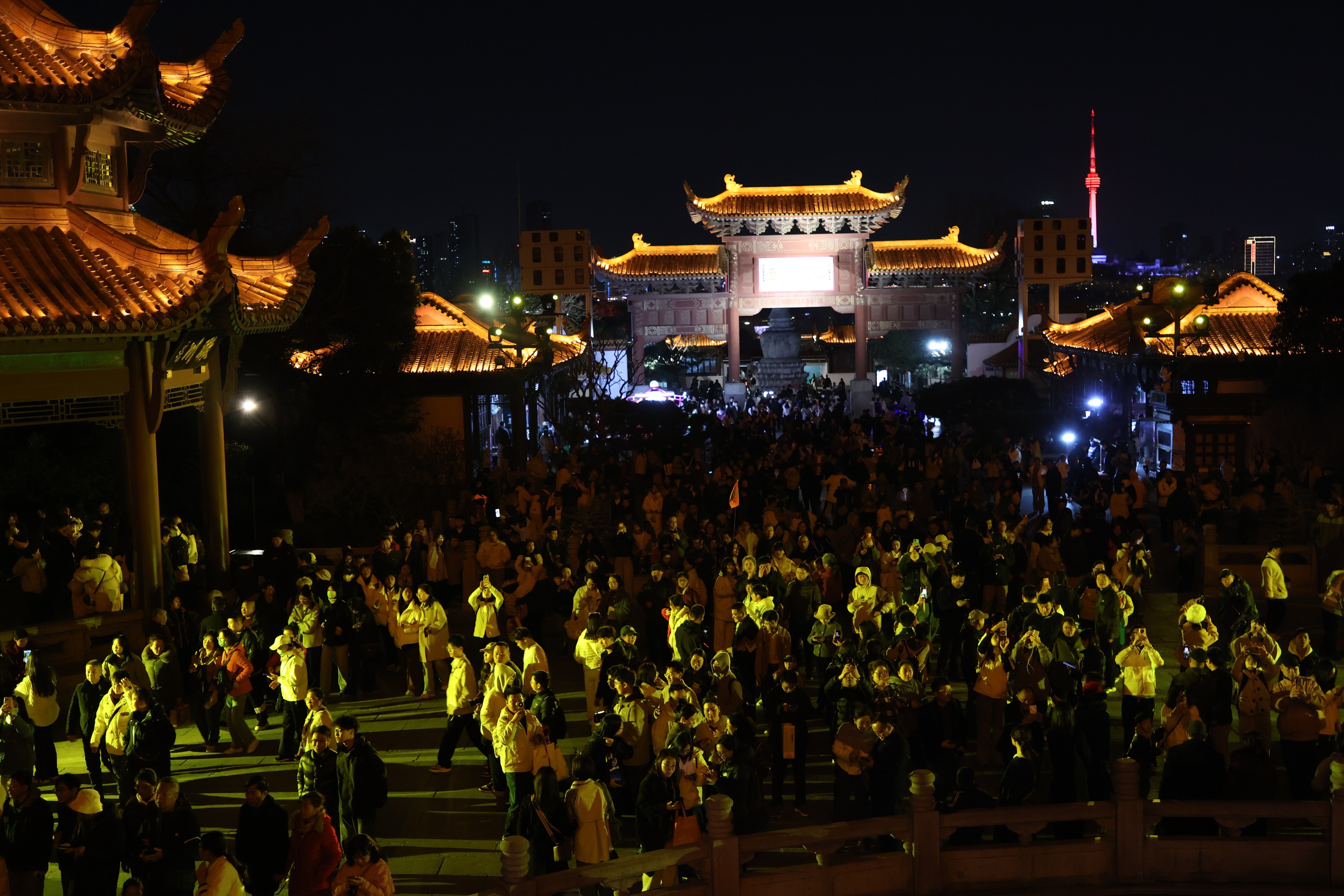游客夜游黄鹤楼公园。图/九派新闻 曾怡婷