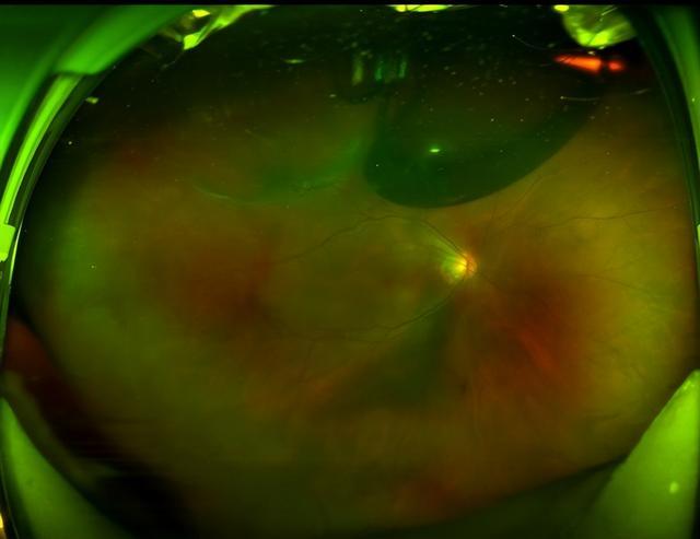 陈忠平教授团队为他检查发现右眼裸眼:0.02 ,配镜无改善;9点至1:30视网膜灰白色隆起,累及黄斑,颞上方可见变性区及多个裂孔,下方周边可见变性区。