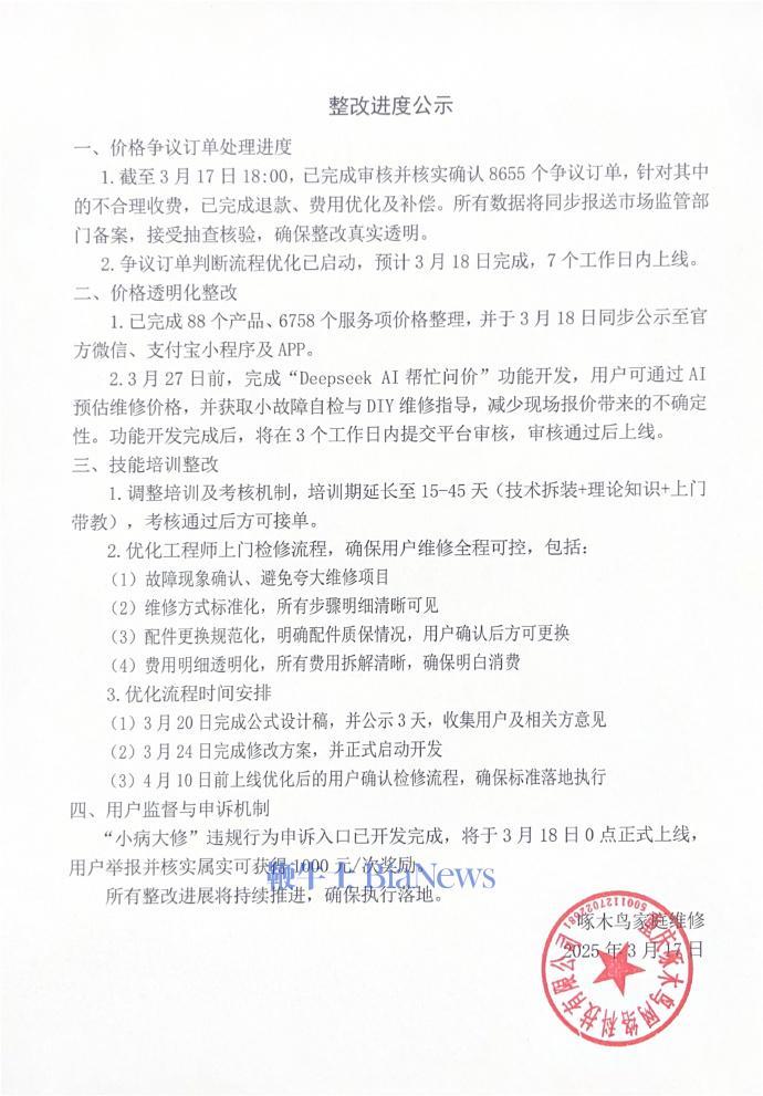 3月18日,啄木鸟家庭维修昨日晚发布整改进度公示,截至3月17日18:00,已完成审核并核实确认8655个争议订单,针对其中的不合理收费,已完成退款、费用优化及补偿。