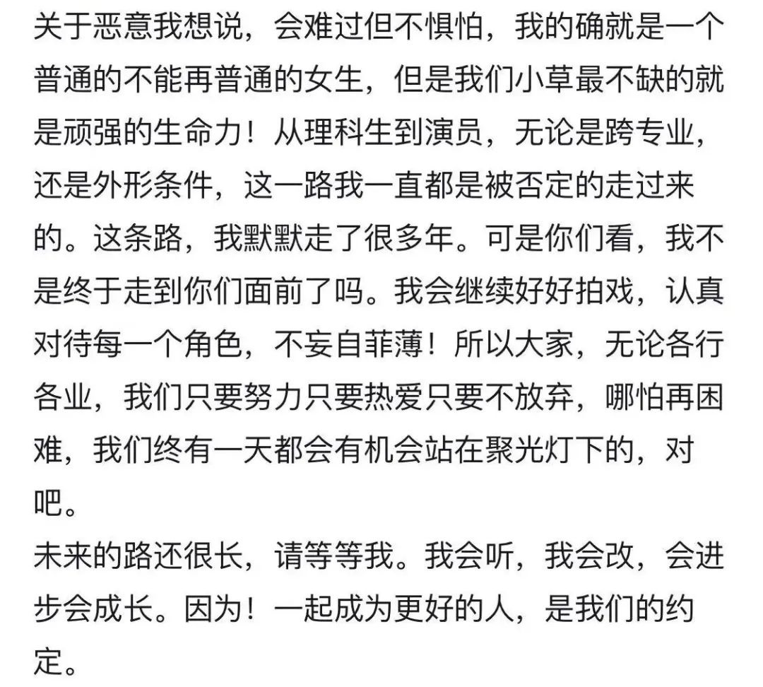 “所以大家,无论各行各业,我们只要努力只要热爱只要不放弃,哪怕再困难,我们终有一天都会有机会站在聚光灯下的。未来的路还很长,请等等我。我会听、会改、会进步会成长。因为‘一起成为更好的人’,是我们的约定。”