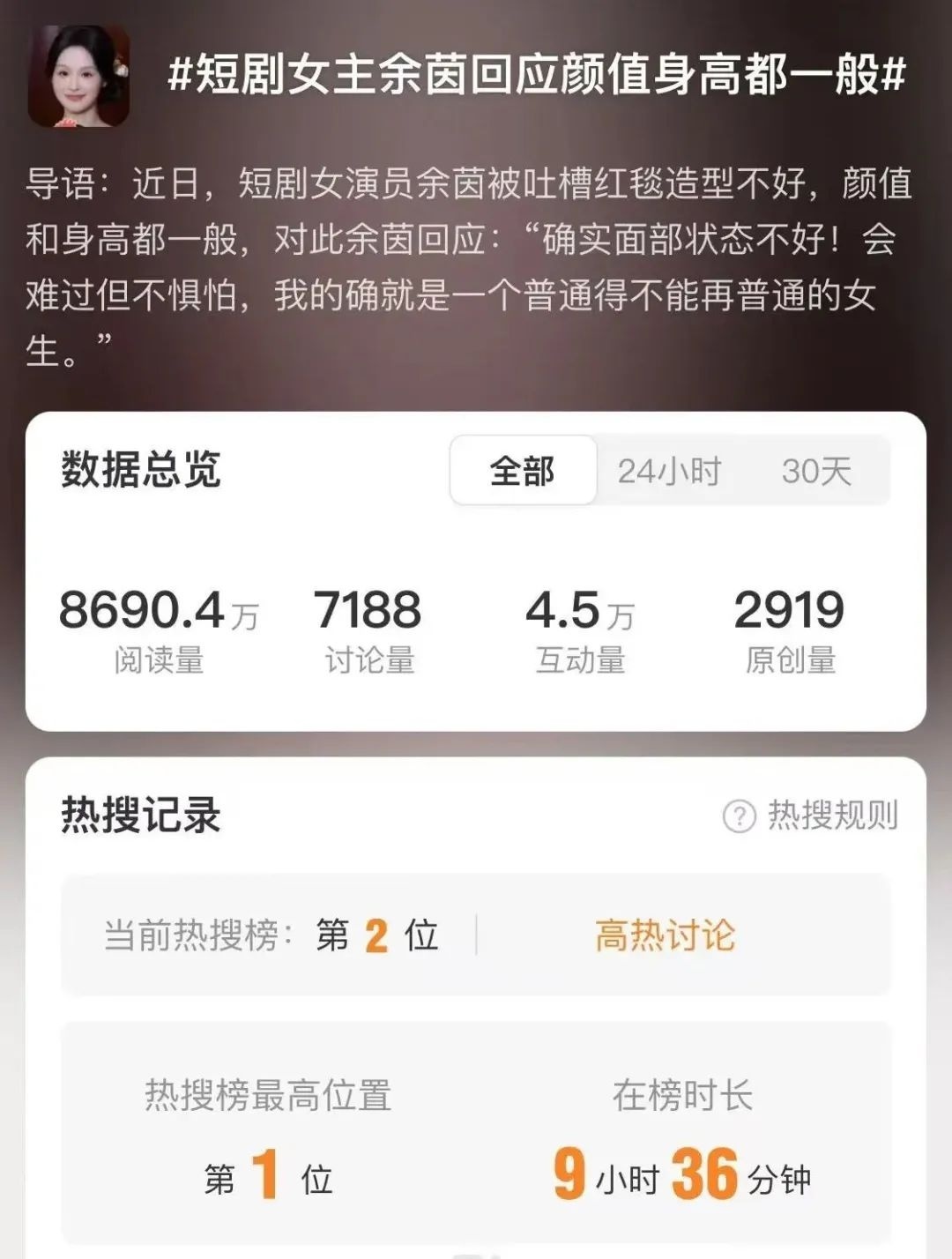 3月18日,话题#短剧女主余茵回应颜值身高都一般#登上微博热搜第一,引发网民关注。