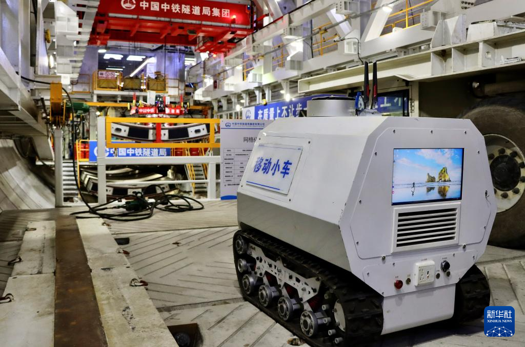 一辆弧形件智能拼装移动小车行驶在沪渝蓉高铁崇太长江隧道“领航号”盾构机施工现场(3月16日摄)。