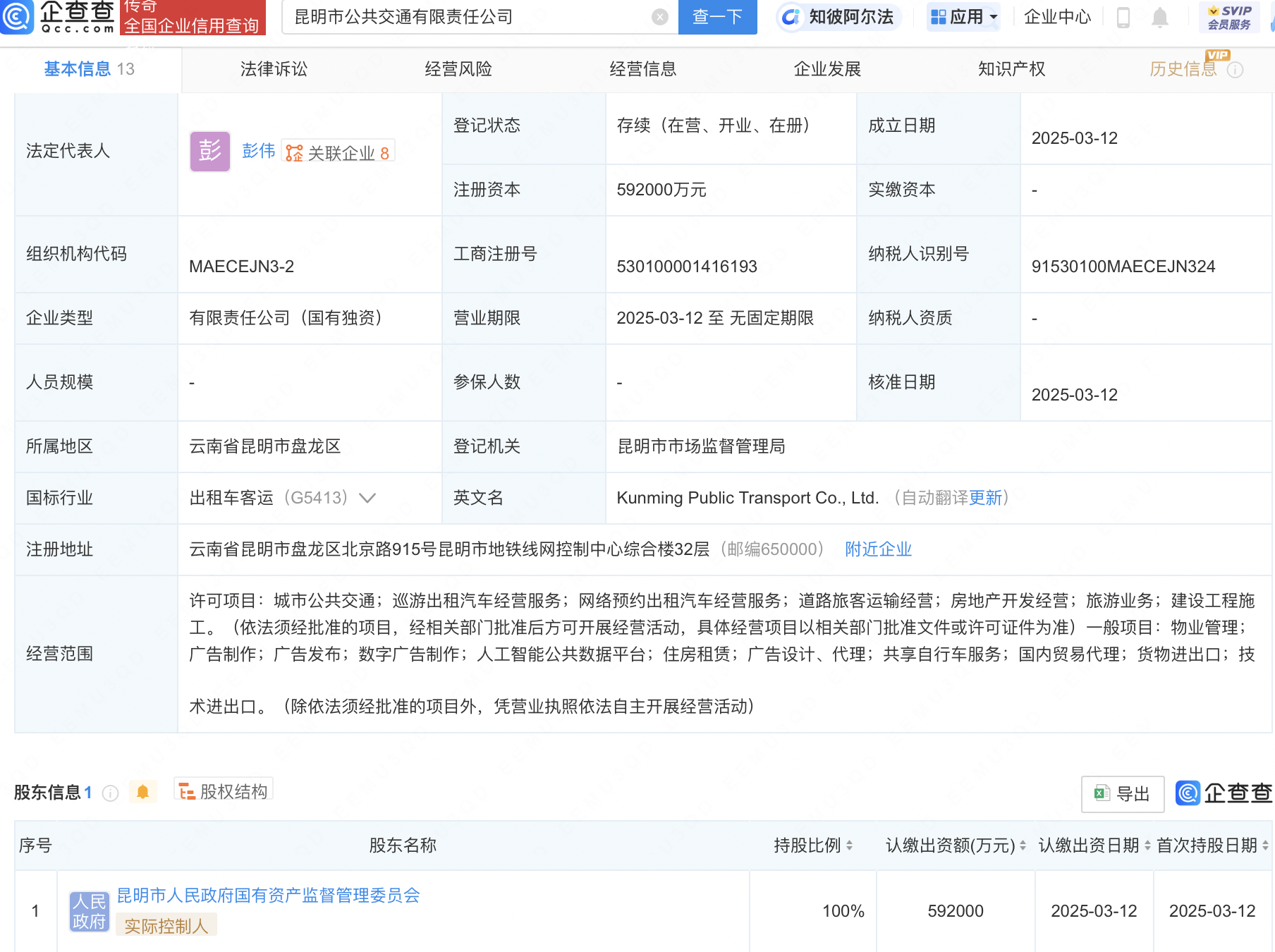 企查查APP显示,近日,昆明市公共交通有限责任公司成立,法定代表人为彭伟,注册资本59.2亿人民币,经营范围含城市公共交通、巡游出租汽车经营服务、网络预约出租汽车经营服务、道路旅客运输经营等。企查查股权穿透显示,该公司由昆明市人民政府国有资产监督管理委员会全资持股。