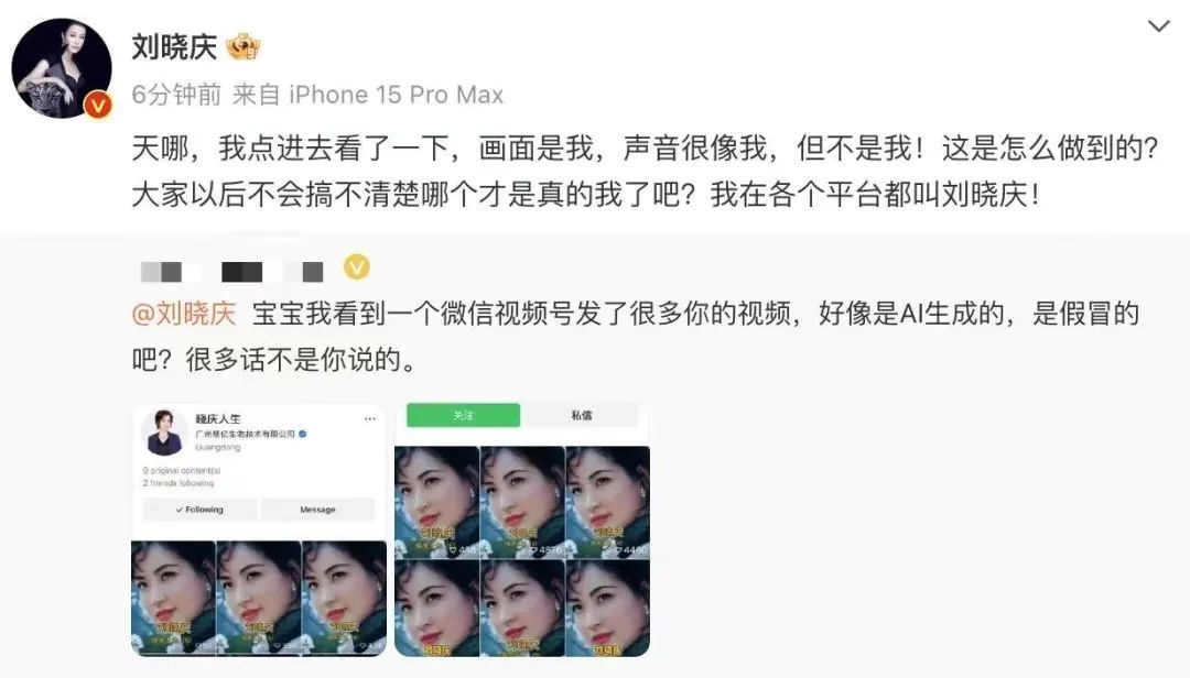 刘晓庆转发并配文:“天哪,我点进去看了一下,画面是我,声音很像我,但不是我!这是怎么做到的?大家以后不会搞不清楚哪个才是真的我了吧?我在各个平台都叫刘晓庆!”