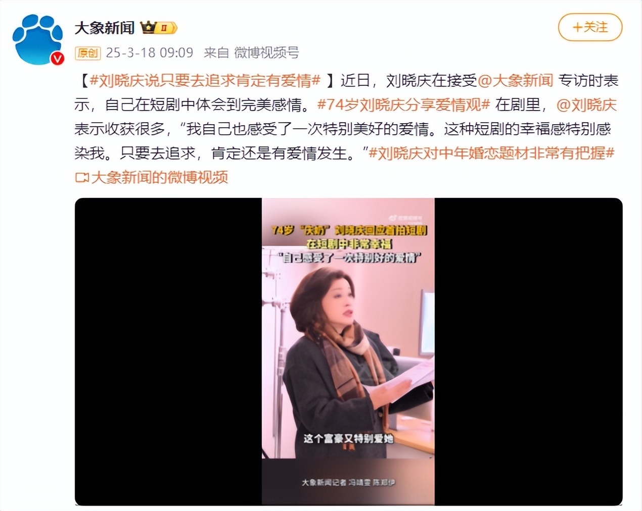 近日,74岁的演员刘晓庆在接受大象新闻专访时表示,自己在短剧中体会到完美感情。