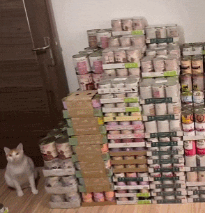 小猫看着满墙的罐头一动也不敢动,愣在原地不知所措…