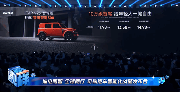 同时,奇瑞猎鹰智驾车型也同步上市。其中,iCAR V23智驾版共推出3款车型,上市指导价区间为11.98-14.98万元,限时先享价11.48-14.48万元。
