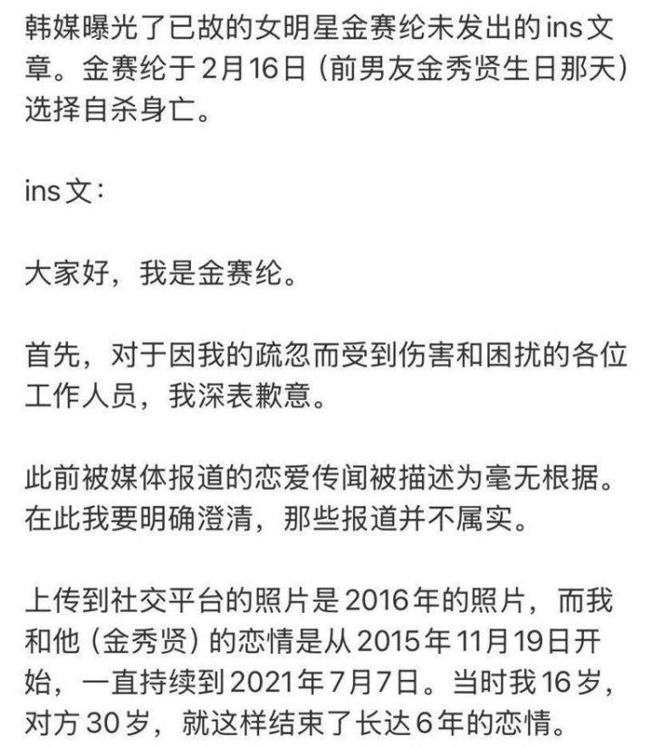2月16号,韩国25岁的女星金赛纶在家自杀身亡。
