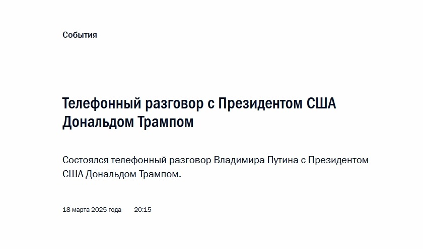 俄罗斯总统网站18日公布普京与特朗普通话的内容。图源:俄罗斯总统网站