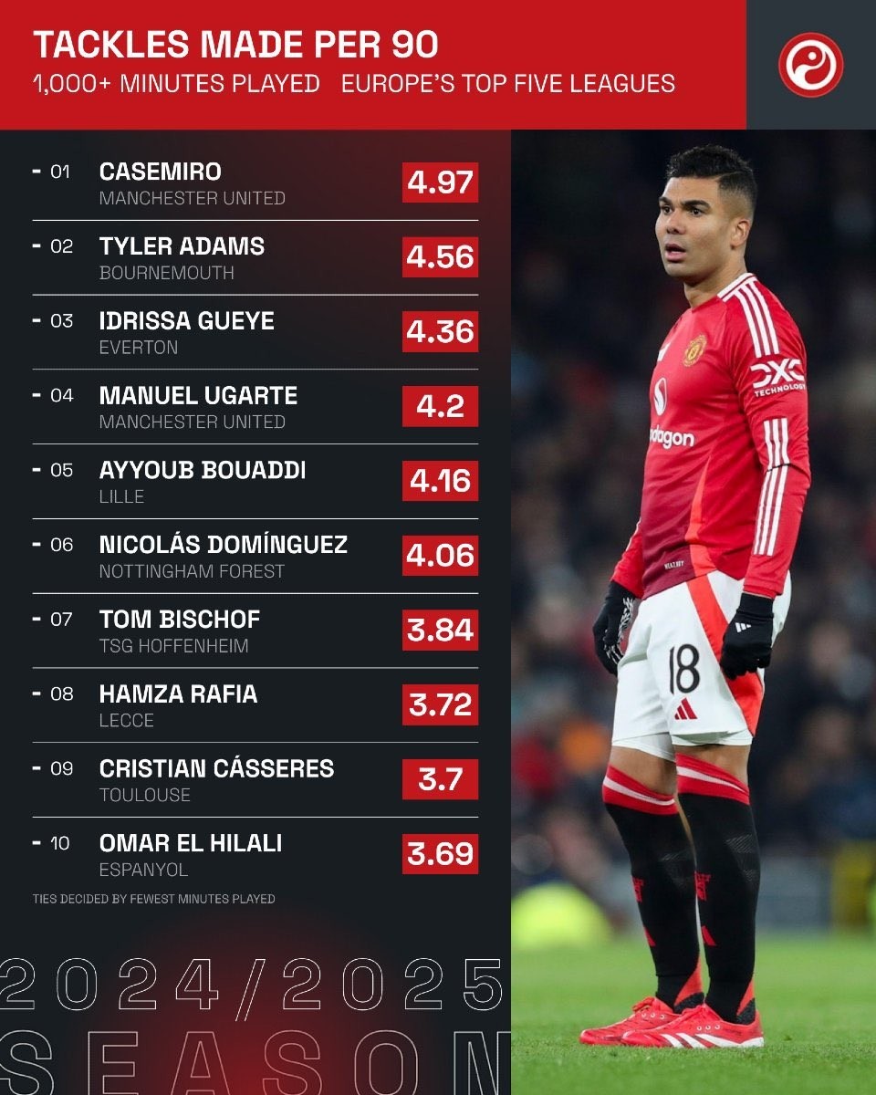 根据足球数据网站Squawka的统计,本赛季五大联赛球员每90分钟完成抢断次数曼联中场卡塞米罗最多,4.97次居首,亚当斯、盖耶紧随其后,乌加特排在第四。