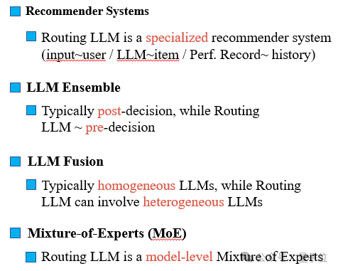 LLM集成:一般LLM集成是post-decision,即让多个LLM完成推理后再合并。而Routing LLM是pre-decision,即在LLM推理前就要决定是哪个LLM来处理;