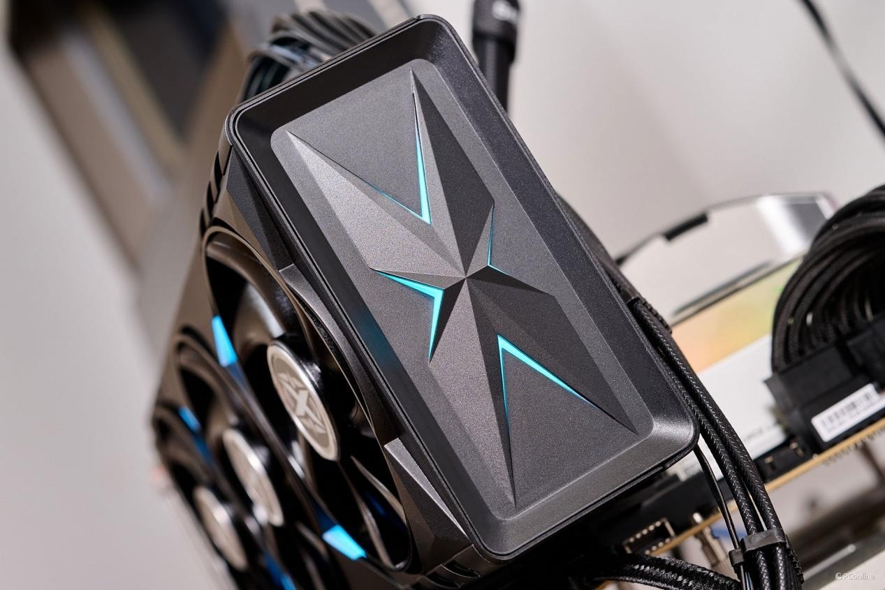 再来看看上机状态,既然它名为炫光,在灯效方面自然不会让人失望,显卡顶部围绕着一圈大面积的RGB灯带,与耕升LOGO灯效相得益彰。