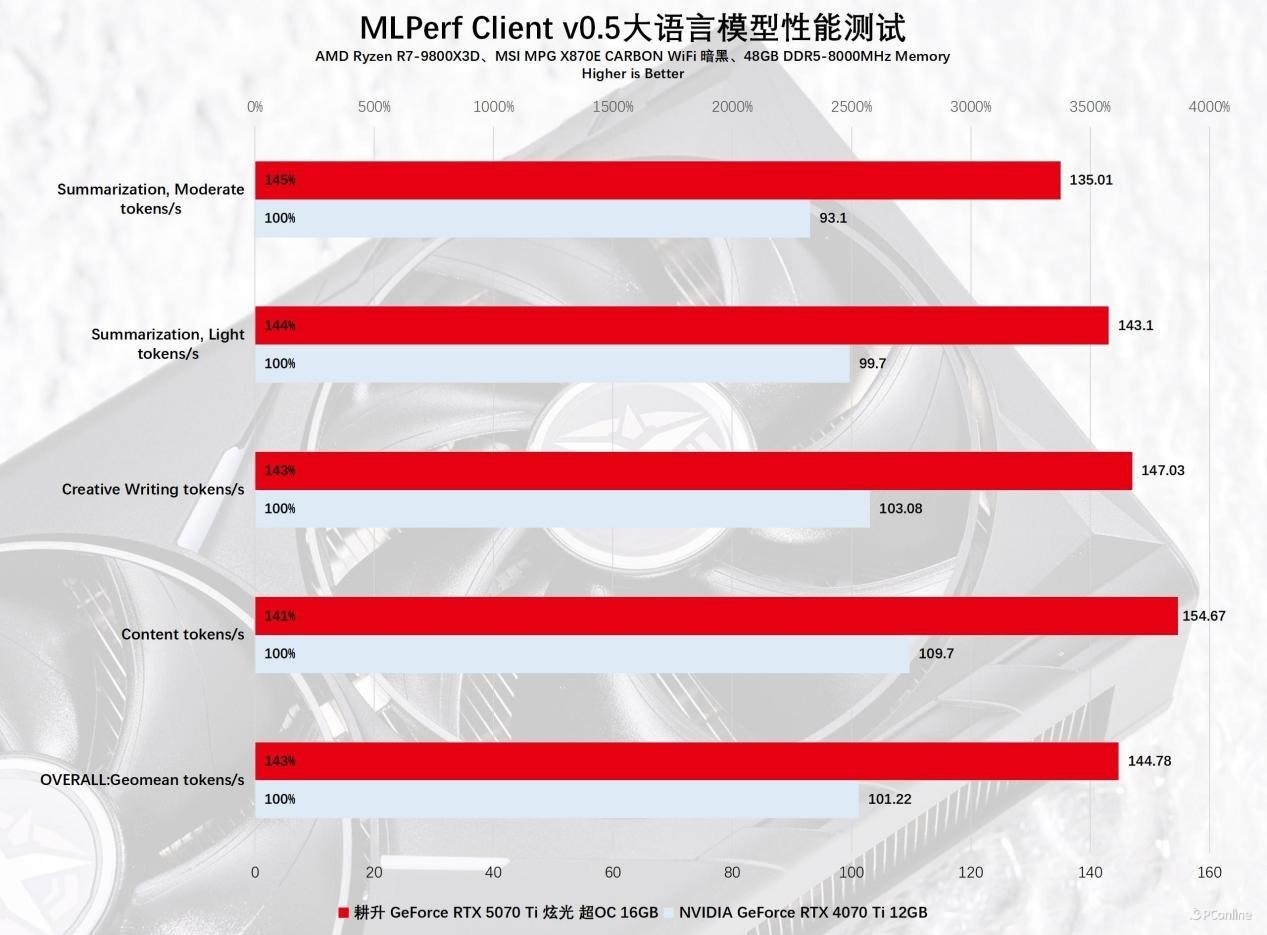 再来看看MLPerf Client v0.5,这项AI基准更倾向于实际应用场景,比如针对创意写作、长文摘要等场景的测试,实测耕升RTX 5070 Ti 炫光的领先幅度均在40%以上,可谓遥遥领先。