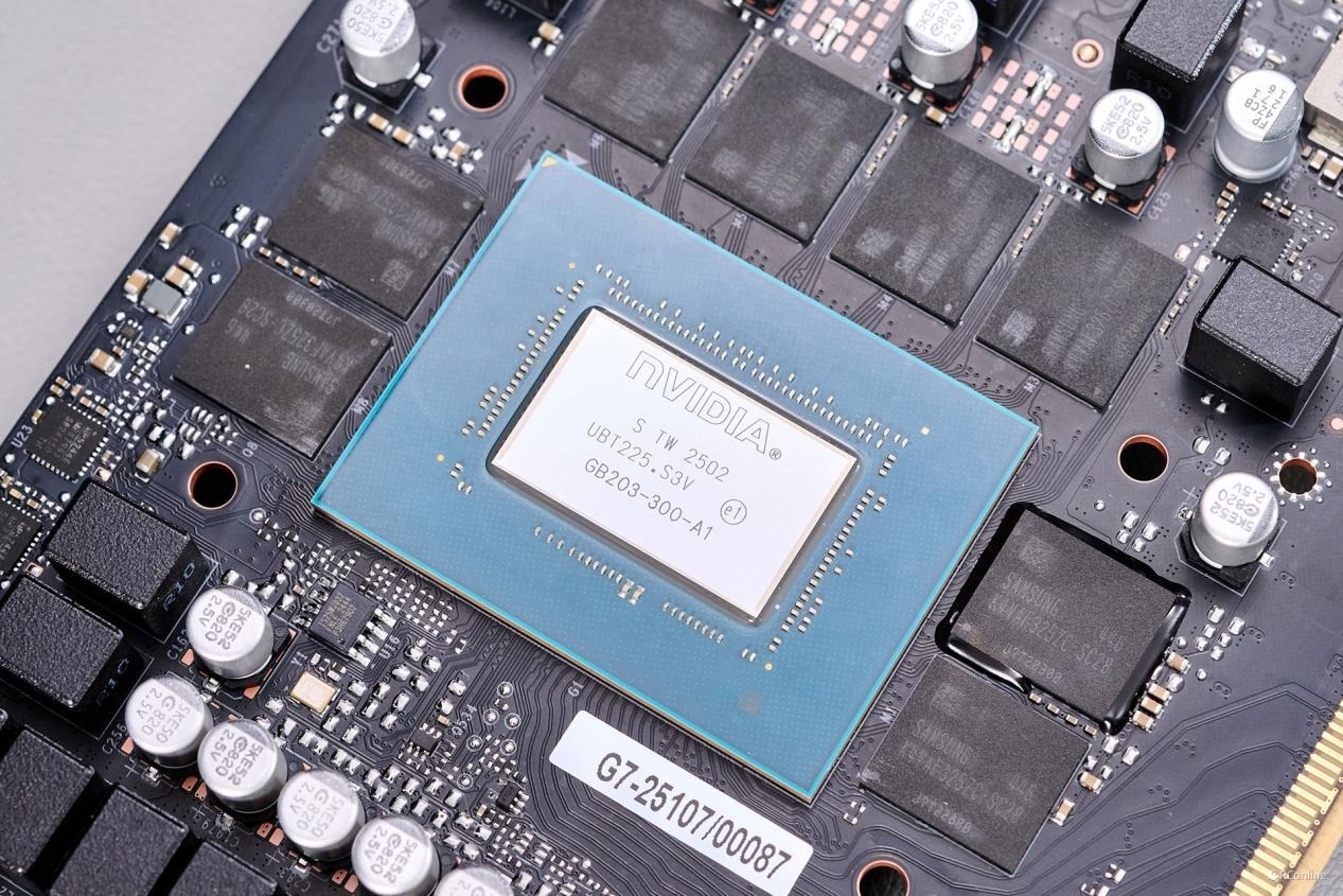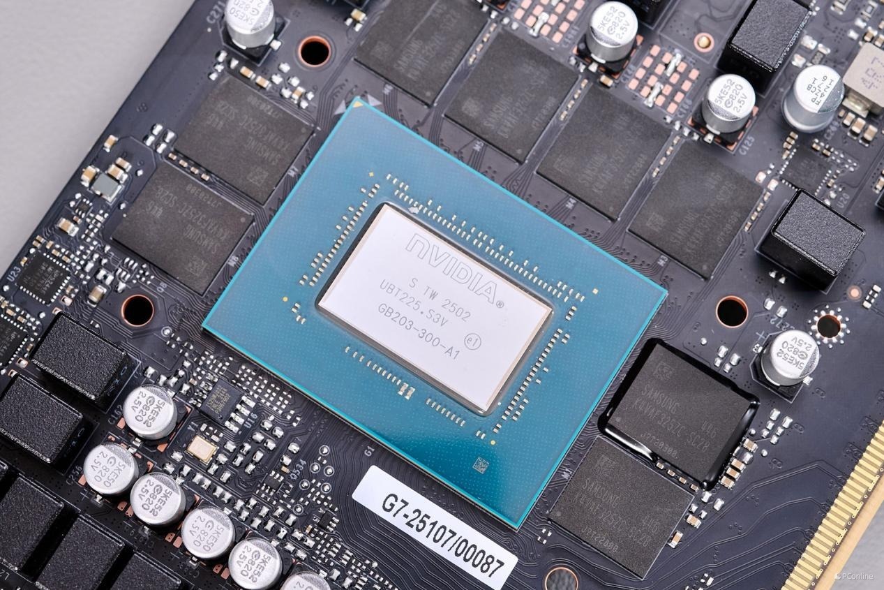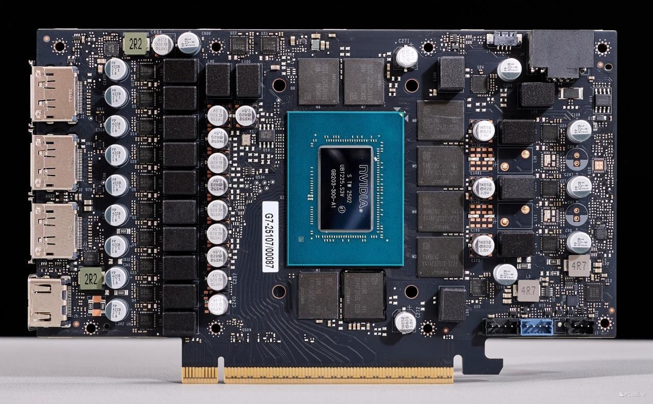 可以看到这张显卡的GPU核心代号为GB203-300-A1,核心一圈围着8颗显存IC。
