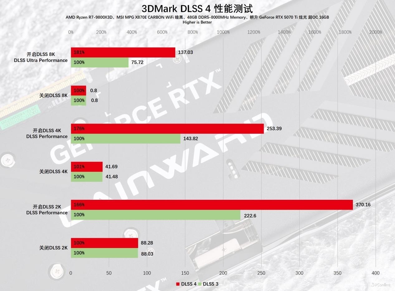 3DMark已经迅速整合了DLSS 4的对比测试项目,从理论性能的角度审视,RTX 50系列显卡的性能展示将极具吸引力。通过实际测试,DLSS 4带来的性能增强效果十分显著。在4K分辨率的测试中,DLSS 4相较于DLSS 3实现了显著的帧率提升。即便在2K分辨率的测试环境下,负载较低时,DLSS 4的帧率也达到了DLSS 3的166%。在8K分辨率的测试中,性能差异尤为突出,启用DLSS 4后,平均帧率达到了137FPS,这种性能的提升堪称耀眼。