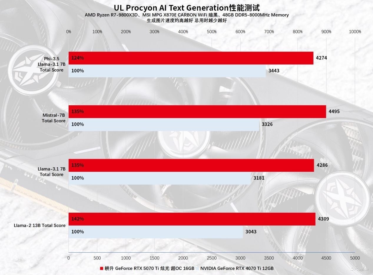 再来看另一个AI基准——AI Text Generation Benchmark,这是一个集合了PHI 3.5、LLAMA 3.1、LLAMA 2等多种大语言模型的基准测试软件。从实测结果来看,耕升RTX 5070 Ti 炫光的表现可圈可点,除了PHI 3.5外,其他基准对比RTX 4080 SUPER均有30%~40%的领先,随着以后FP4精度模型的推广和普及,RTX 50系的优势势必越来越明显。