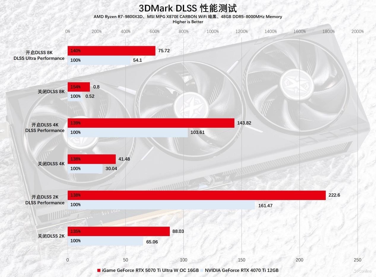 先看看3DMark提供的DLSS 3测试,正如前面提到的结论,新老两代显卡在图形负载越高的时候,性能的差异会越明显,比如8K样例开启DLSS的时候,耕升RTX 5070 Ti 炫光 超OC的性能足足是RTX 4070 Ti的140%,这也真实反映出两者在面临实际游戏场景时的性能差异。