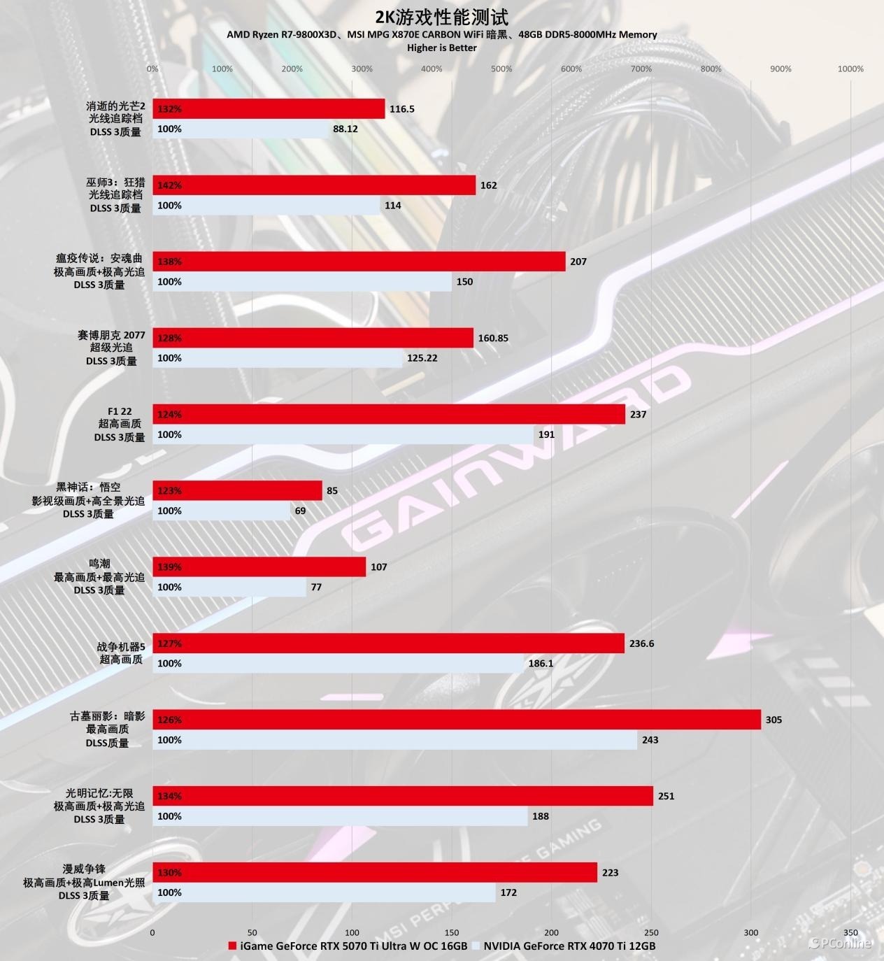 先看看基础的游戏性能,我们测试了《光明记忆:无限》《古墓丽影:暗影》《战争机器5》等11款游戏,并比较耕升RTX 5070 Ti 炫光(超频模式,下同)与RTX 4070 Ti在2k分辨率下最高/极致画质设置下的平均帧差异。