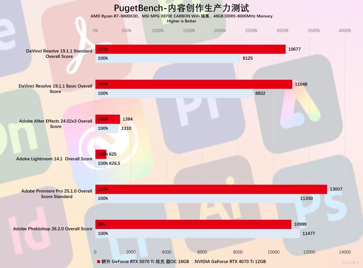 再来看看更贴合真实使用场景的创作力基准——Pugetbench创作力跑分测试,在几款Adobe基准中耕升RTX 5070 Ti 炫光在达芬奇、PR的创作软件的代际性能提升明显,达芬奇软件的测试基准得分代际提升来到了25%以上。