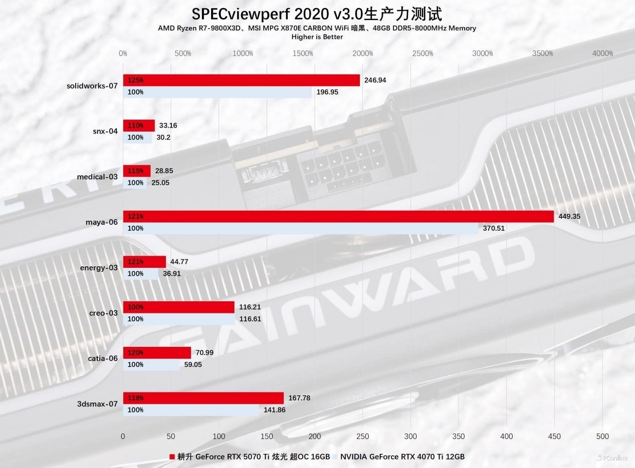 最后是喜闻乐见的工业领域专用软件基准SPEC2020,这项基准测试涵盖了市面上多个工业级生产力软件,能一定程度上反映出显卡的工业生产水平。实测除了creo-03基准外,耕升RTX 5070 Ti 炫光 超OC的代际提升均十分显著,而且提升幅度在10%到25%之间。