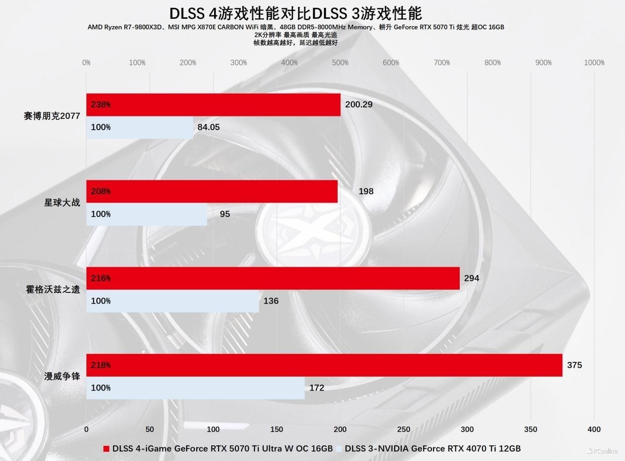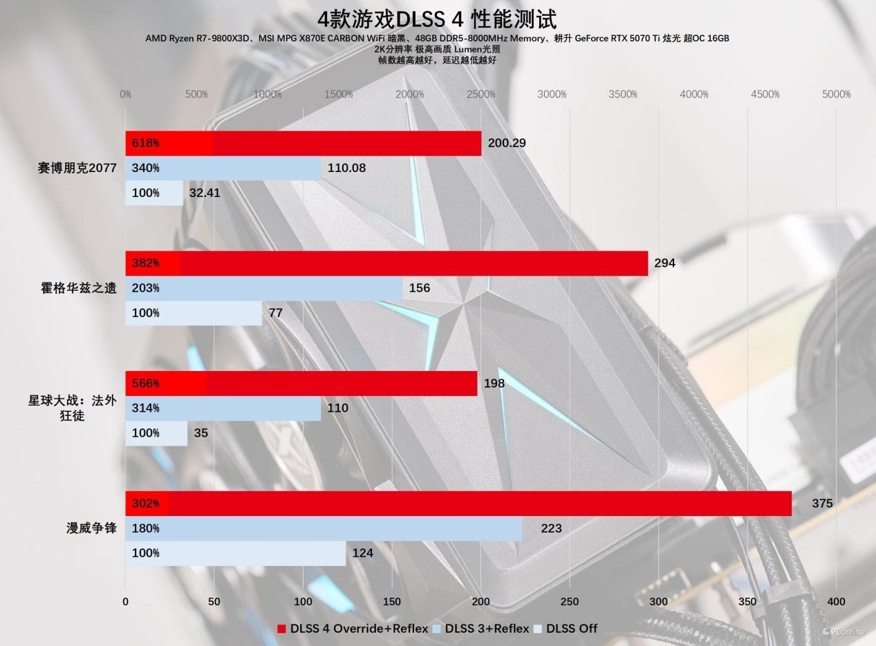尽管尚未展示RTX 50系列的杀手锏——DLSS 4,但通过比较耕升RTX 5070 Ti 炫光与RTX 4070 Ti的帧率表现,我们可以清晰地看到,DLSS 4(X4)确实为平均帧率带来了显著的提升。