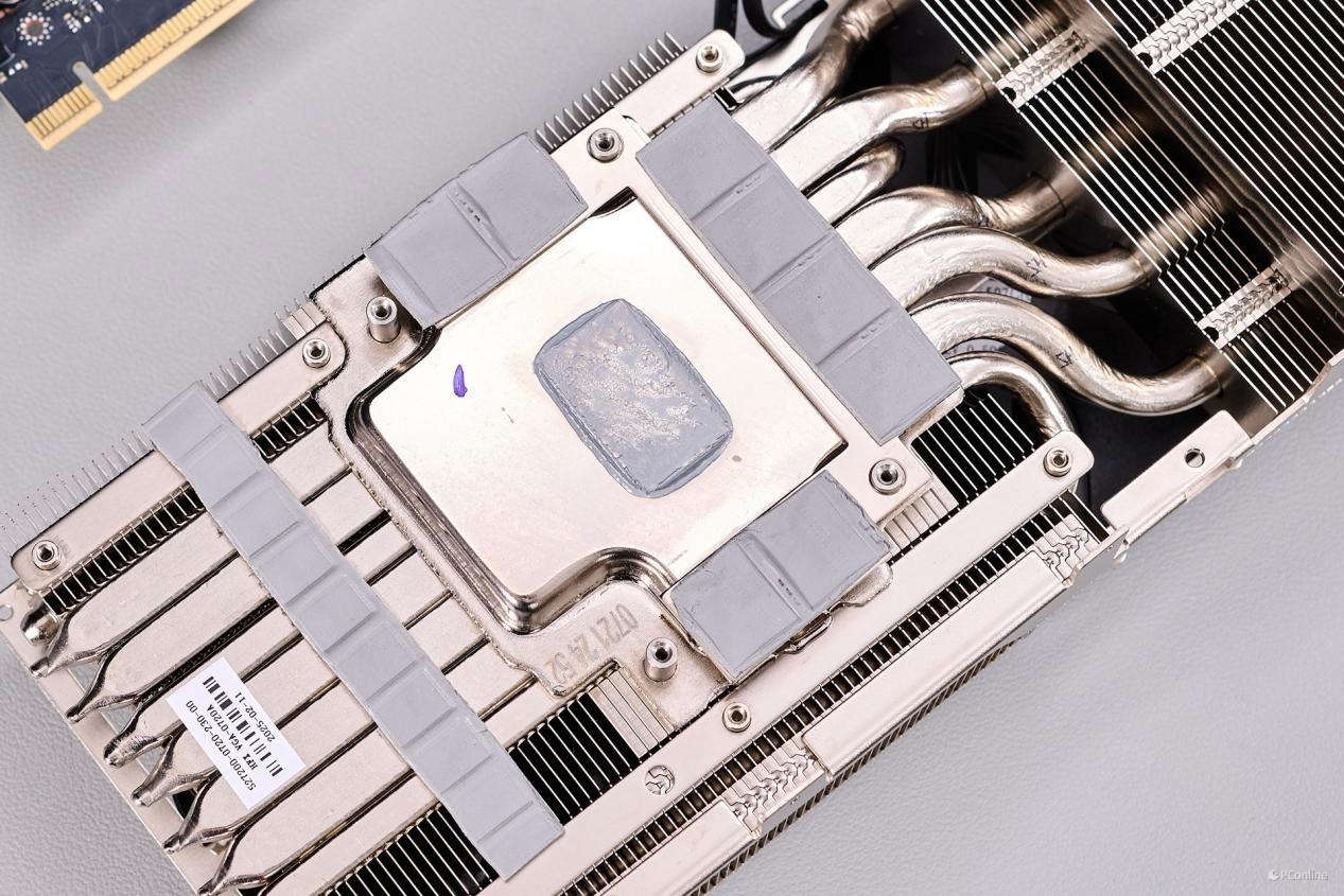 从全家福拆解图可以清晰看到,耕升RTX 5070 Ti 炫光 超OC主要包括PCB、散热鳍片、合金中框、散热器外框、背板五个部分。散热鳍片上的真空腔均热板+七根镀镍热管组合十分瞩目,其中均热板直接覆盖GPU核心与显存。