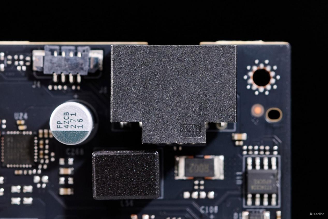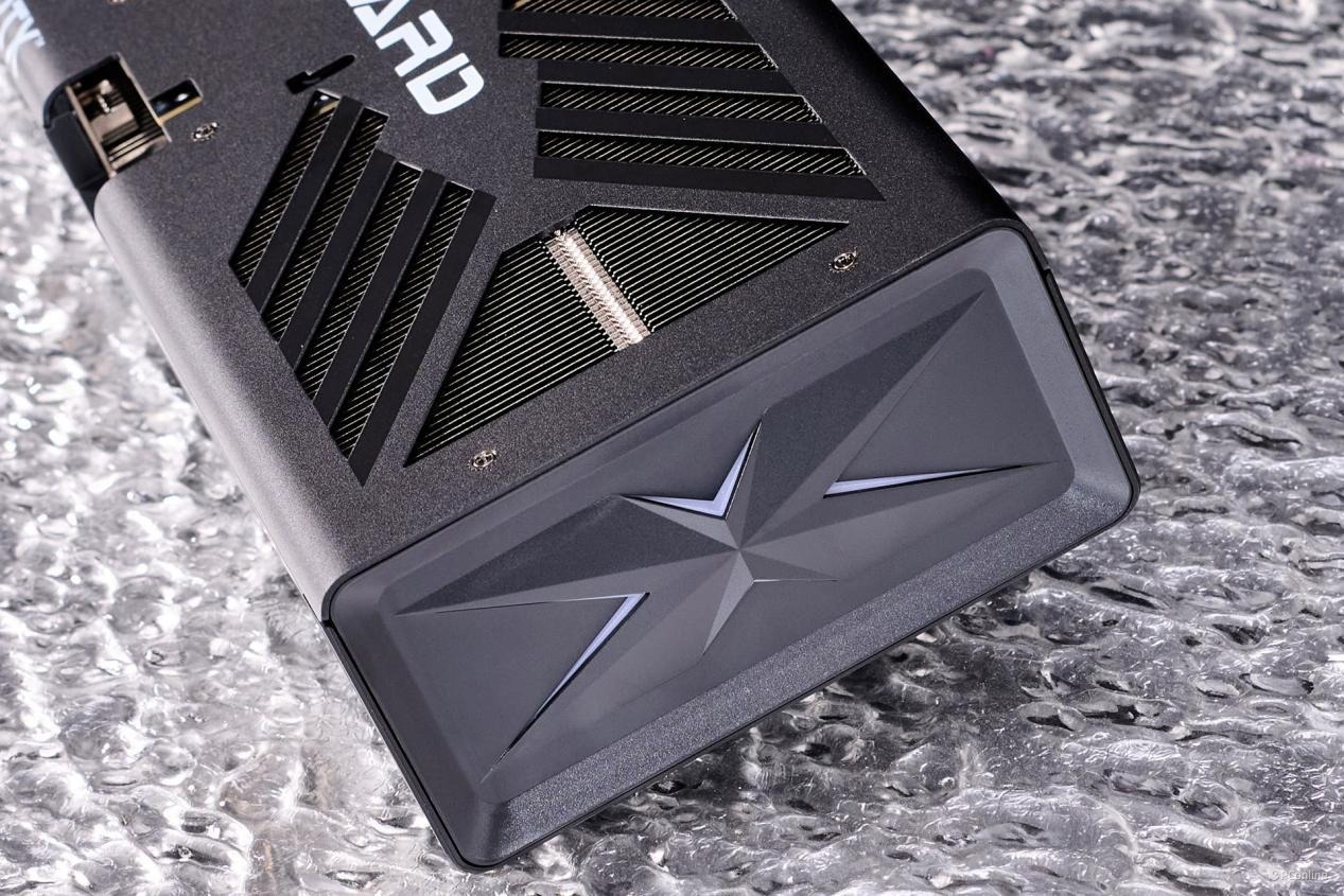 经典的12V-2x6接口位于显卡靠近中央的位置,旁边则是灯光同步接口。