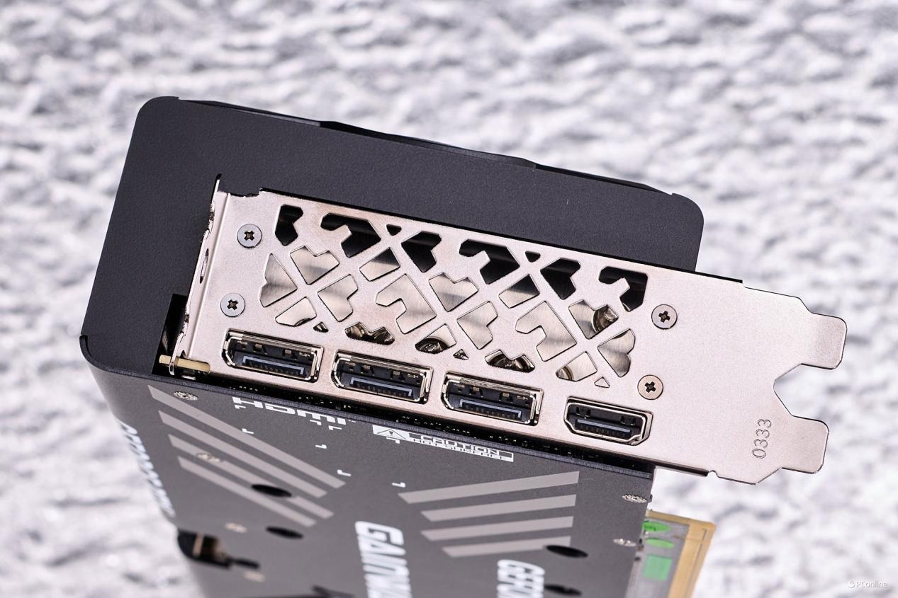 翻到IO挡板,这里也有些小巧思,挡板上的镂空造型并非传统的横条散热格栅,而是心型和C型组成的耕升镂空LOGO。接口方面,该卡提供3个DisplayPort 2.1b和1个HDMI 2.1b接口。