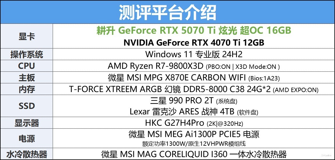 纸面数据就点到即止,接下来我们直奔主题,看看耕升RTX 5070 Ti 炫光的游戏表现。开始分享数据前先介绍一下咱们的测试平台配置:我们采用了游戏神U——AMD锐龙7 9800X3D,与之搭配的主板是微星高端主板MSI MPG X870E CARBON Wi-Fi暗黑,以及芝奇Trident Z5 RGB 幻锋戟 DDR5-8000 C38 24GB*2,这套平台的性能理应能将耕升RTX 5070 Ti 炫光 超OC的游戏性能完全发挥出来。
