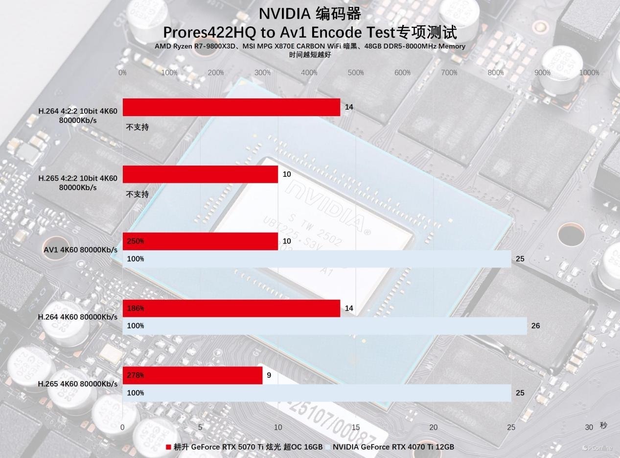 实测结果着实让人印象深刻,耕升RTX 5070 Ti 炫光 超OC导出这三条不同格式的4K视频比RTX 4070 Ti节省了快一半的时间,尤其是导出逐渐会成为主流的AV1格式视频,用时节省了一大半。而且正如前面所言,它还支持编码4:2:2色度取样的视频,而且实测的导出时间也很优秀。有了这项新特性,耕升RTX 5070 Ti 炫光 超OC不但能为创作者节省大量时间,更能帮助创作者轻松输出更高清无损的视频样例。