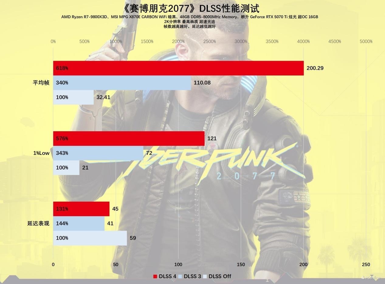 测试结果令人震惊,当开启【DLSS 4帧生成4X】后,这4款游戏的平均帧率都实现了飞跃性的提升,《赛博朋克2077》的平均帧率甚至达到了原来的6倍。过去我们可能会将这种现象归咎于BUG,但英伟达已经将之变成了现实中的常态。