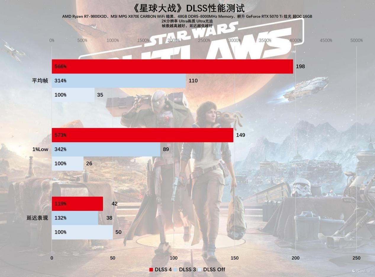 接下来是《星球大战:法外狂徒》,在2K分辨率且未启用DLSS的情况下,26 FPS的1%LOW帧率几乎可以被称作灾难。然而,DLSS 4再次施展其神奇力量,将一款在画质全开时几乎无法游玩的游戏变得流畅,平均帧率足以轻松满足2K@144电竞显示器的需求。
