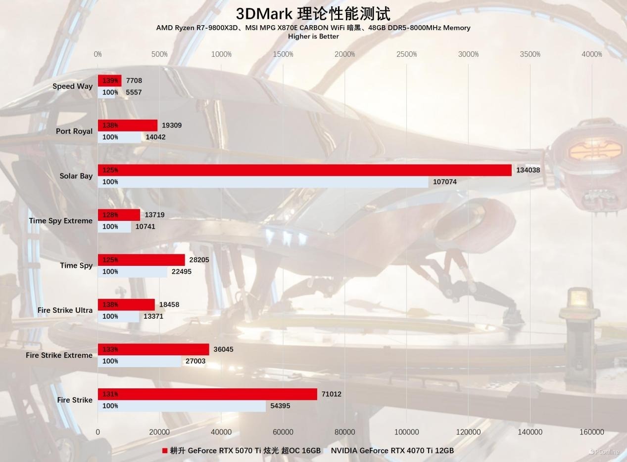 显卡的基本情况分享完毕,接下来当然就是性能实测环节,首先看看理论性能如何,咱们主要参考3DMark基准。在Fire Strike Ultra的基准测试中,耕升RTX 5070 Ti 炫光 超OC的性能大约是RTX 4070 Ti的138%;到了DX12的Time Spy测试中,前者性能是后者的128%;在对显卡压力最高的Speed Way基准中,新卡领先幅度又回到了39%。可见随着图形负载的压力越大,新老两代显卡的性能差异会越来越大。