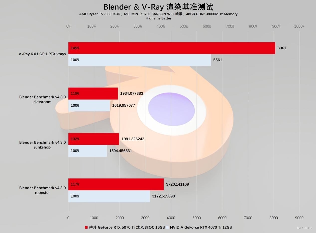 接着是3D渲染软件的性能评估,我们选择了Blender与V-Ray的基准测试。实测耕升RTX 5070 Ti 炫光 超OC在这几个3D渲染基准中平均领先RTX 4070 Ti大约28%。