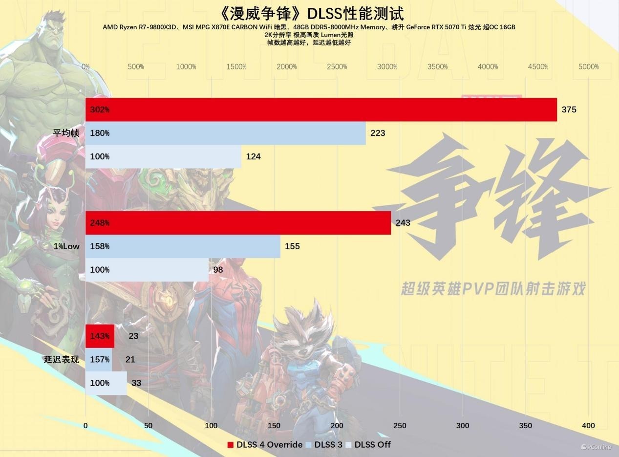 最后是喜闻乐见的《漫威争锋》,竞技类网游对帧率的要求十分高,而这款游戏却有大量画质设定,画质拉满的话配置要求并不低。在2K分辨率未开启DLSS时,耕升RTX 5070 Ti 炫光 超OC的1%LOW为98 FPS,平均帧率仅为124 FPS,对于一款竞技网游来说这帧率表现只算及格。现在有了DLSS 4帮忙,同一张卡的平均帧率突破至375 FPS,1% LOW帧也有243FPS,这流畅度能让高端玩家赢在起跑线。