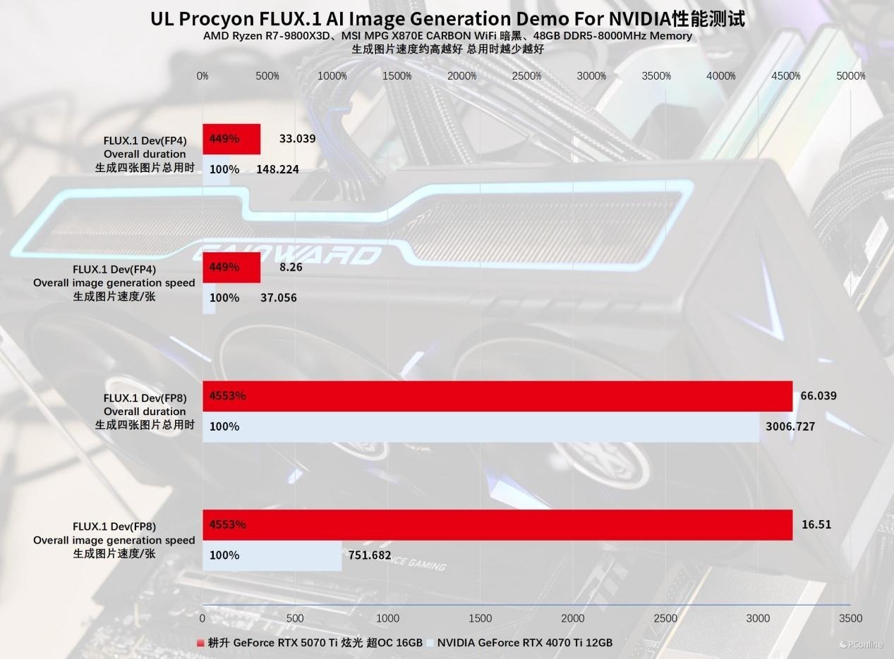 FLUX.1 AI图像生成演示软件针对NVIDIA基准的测试结果,不仅揭示了FP4精度的潜力,还凸显了在AI应用中大显存容量的显著优势。在FP8精度下,两块显卡的性能差异显著,尽管数百倍的性能差异显然不是两种显卡真实算力的直接反映,但根本原因在于它们显存容量的差异。当RTX 4070 Ti的12GB显存溢出时,部分任务不得不转为CPU+GPU“混合双打”,这会显著降低性能表现。然而,在FP4精度下,性能表现得更符合实际情况,RTX 4080 SUPER需要超过半分钟才能生成一张图像,而GAINWARD RTX 5070 Ti 炫光仅需8秒,这一对比充分展示了原生FP4精度的优势。
