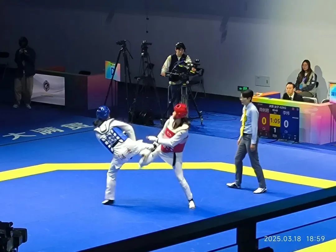 3月18日,从2025年全国跆拳道锦标系列赛女子62公斤级决赛现场传来喜讯,江西队运动员周俐君,以第一局5:2、第二局7:5直落两局,战胜湖南选手李炜强势夺冠!