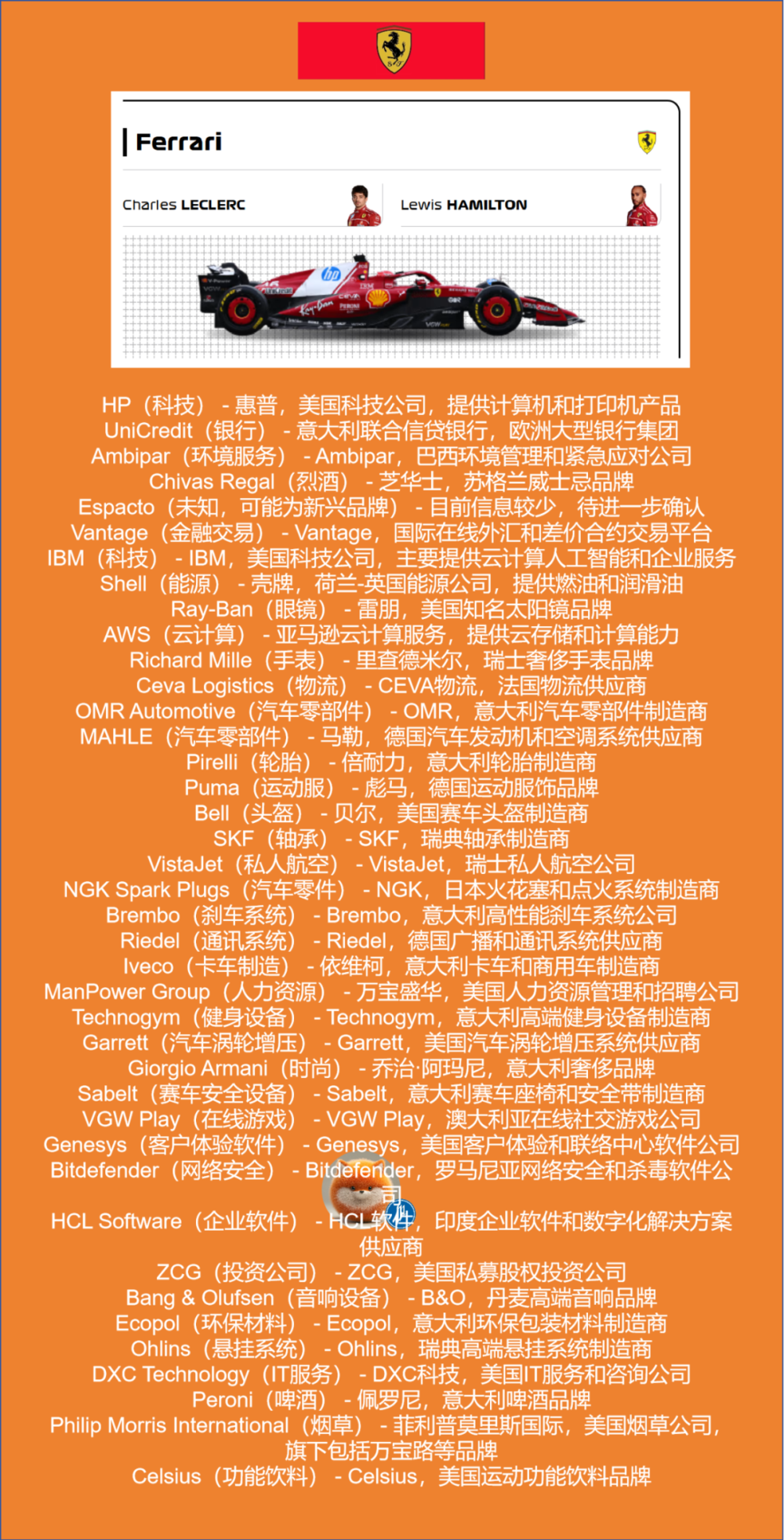 2025 赛季,十支车队的赞助商名单已经出炉,头部大厂几乎可以在头部车队上找到身影,透过这些金主的名字,我们不仅能看出谁最有钱,还能一窥全球商业趋势。除了像壳牌、倍耐力、阿迪达斯这样传统品牌,更多像Visa、万事达这样的金融机构,Oracle、微软、Google、IBM这样的科技公司也都在列。