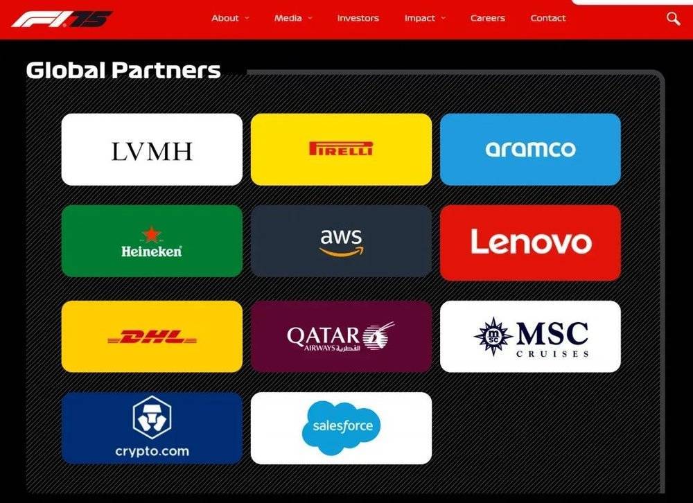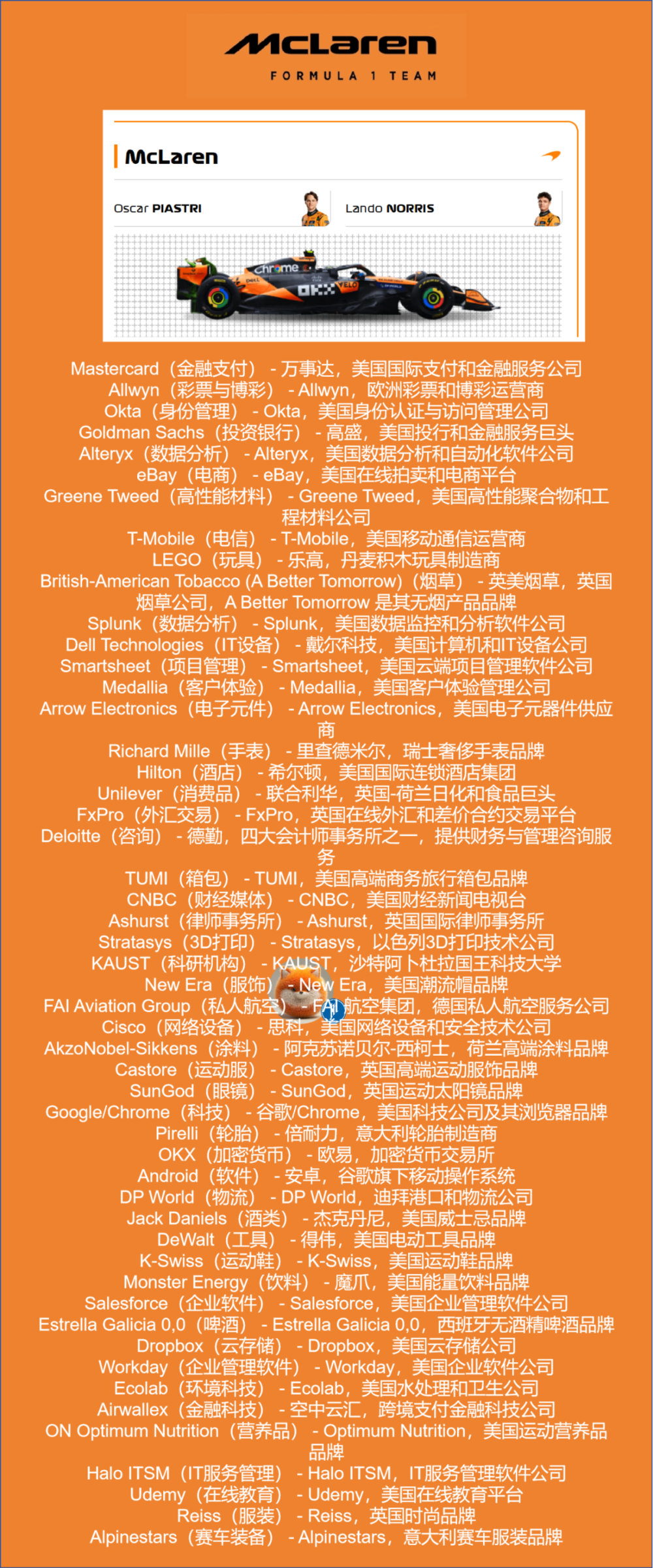 此外,还有主要合作伙伴这一层级的赞助商。例如,亚马逊AWS为梅赛德斯车队提供赞助,壳牌与法拉利紧密合作,谷歌则选择迈凯伦作为合作伙伴。这些公司每年投入的资金从500万到5000万美元不等,通过与车队的合作,在全球范围内进行品牌推广和市场营销活动。