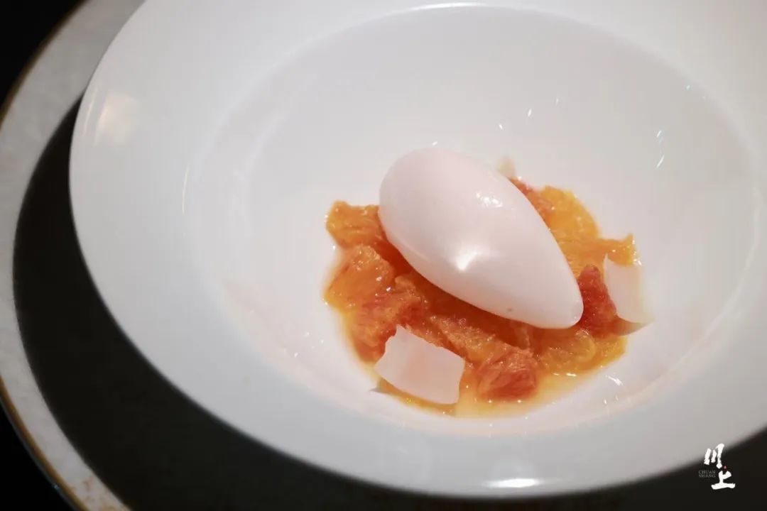 重口味之后要加一个清口的小品菜,做一个过门儿,这时往往是一个清凉酸甜的小品,那天上的是梅见白羊柠檬雪芭。选用来自重庆长寿湖的血橙,果肉紫红,脆嫩多汁,甜酸适口。现榨血橙汁凝成冰霜,加上春日脆嫩的鲜百合。一勺舀下,酸甜回甘。