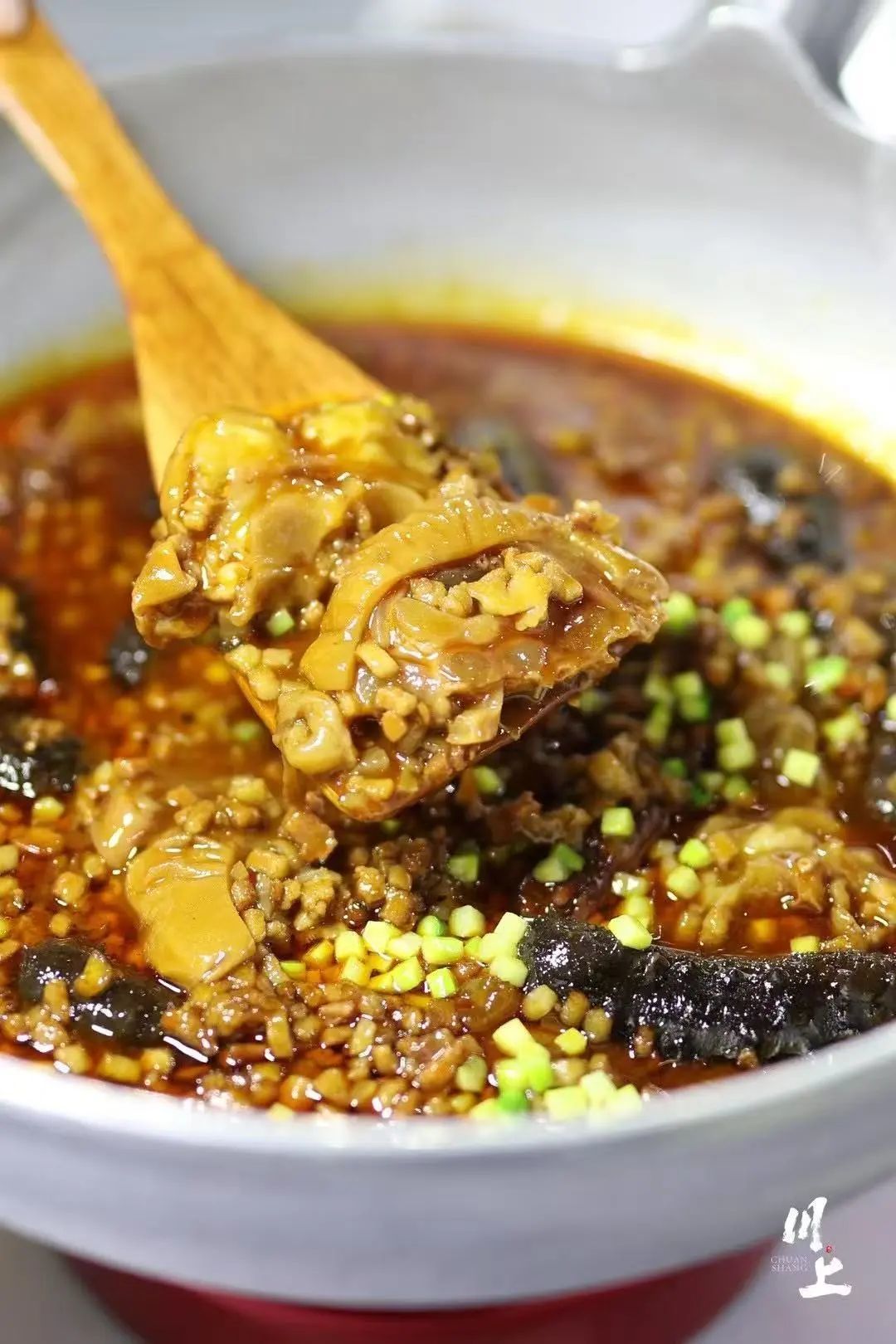 其实完成的很好,本地黄牛带皮牛筋,加入陈年豆瓣,经过文火慢炖,软糯弹牙,处理的很干净,没有任何腥臊味道;而海参也中规中矩,发制合格,没有很水的水味,很透,入味。其实在传统川菜之中,也有一款很著名的海参,干烧绍子海参,其中要义在于海参发制,绍子的味觉调配,干烧的手法工艺,也是颇见功底的一道名菜。这道家烧海参的讨喜之处是豌豆尖的加入,重庆人的日常生活呼之欲出。