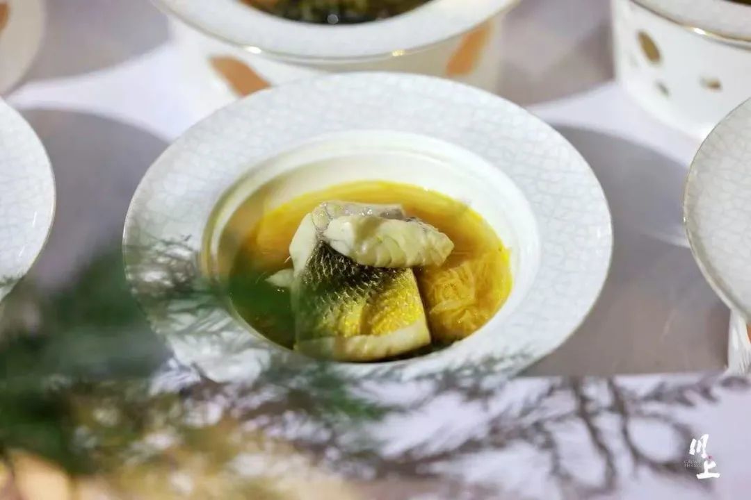 主菜来了,第一道是龙头菜酸汤煮闽东大黄鱼。