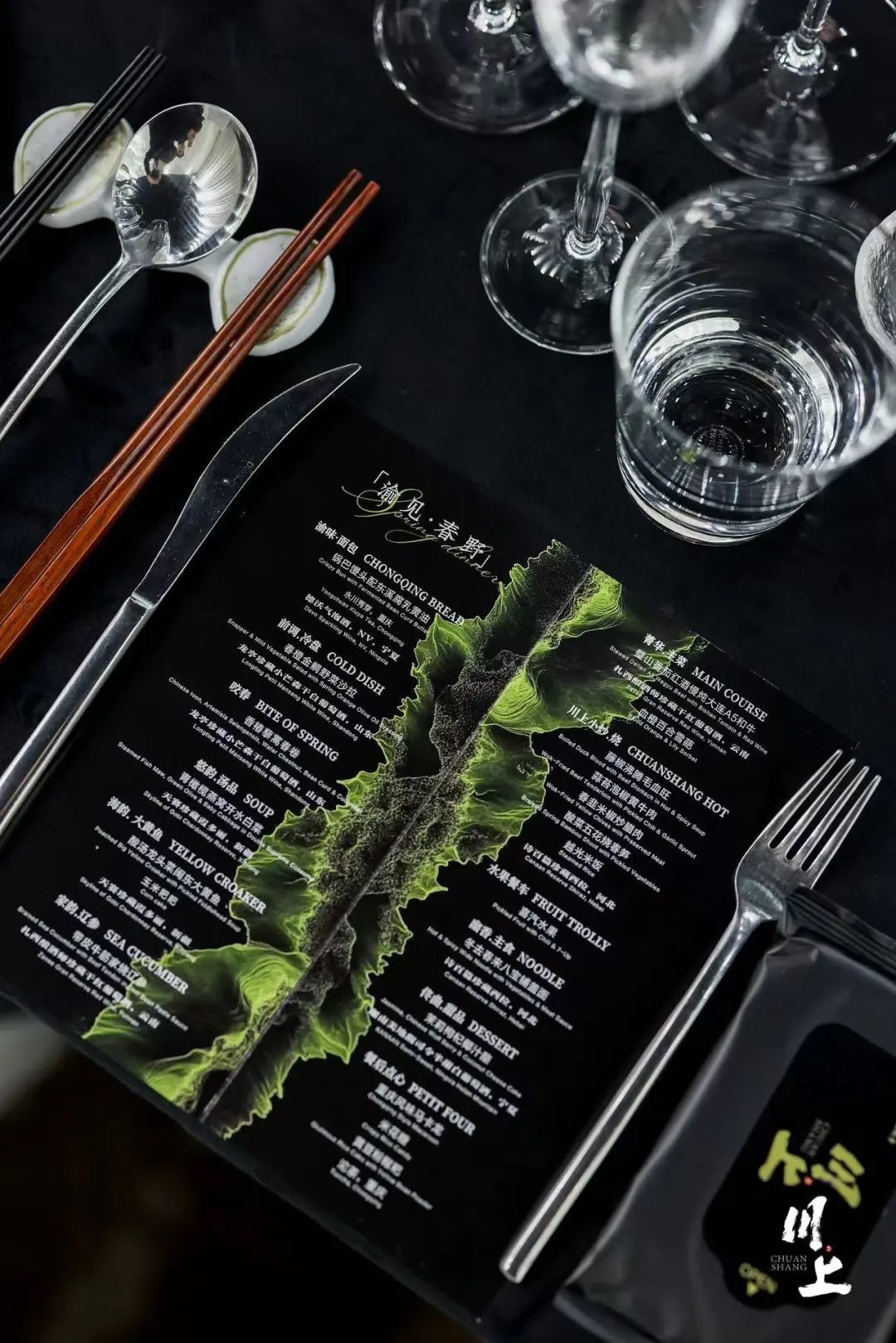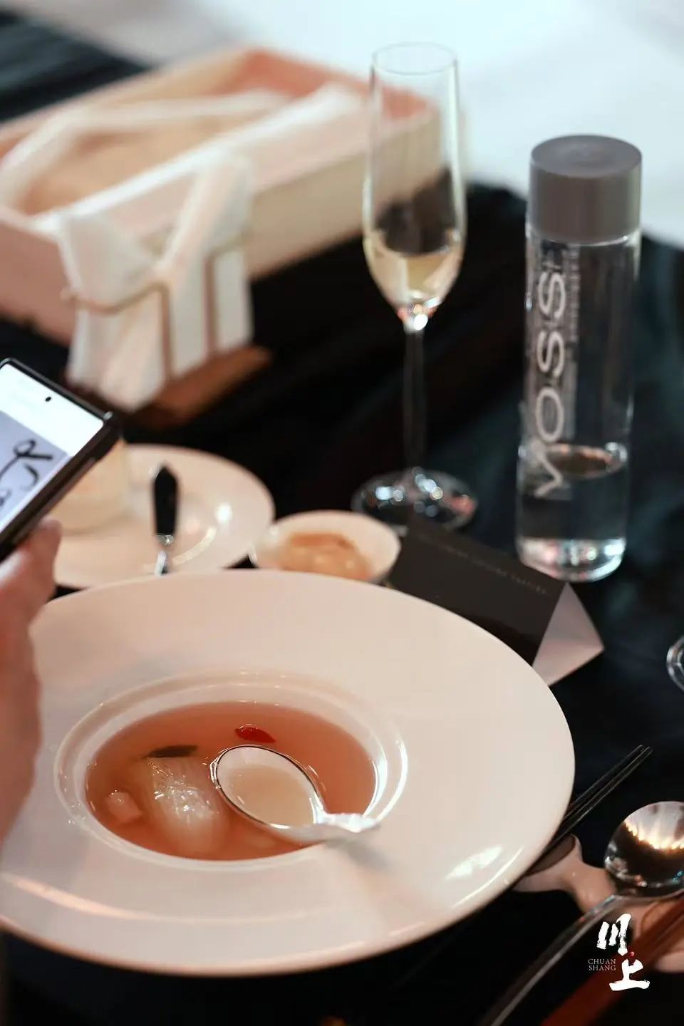 每个人面前都有菜单,当看到菜名与配酒时,觉得有点意思,至少跟我理解的重庆风格有了变化,而VOSS的出现,也让我对这餐在期待之余多了一分笃定。