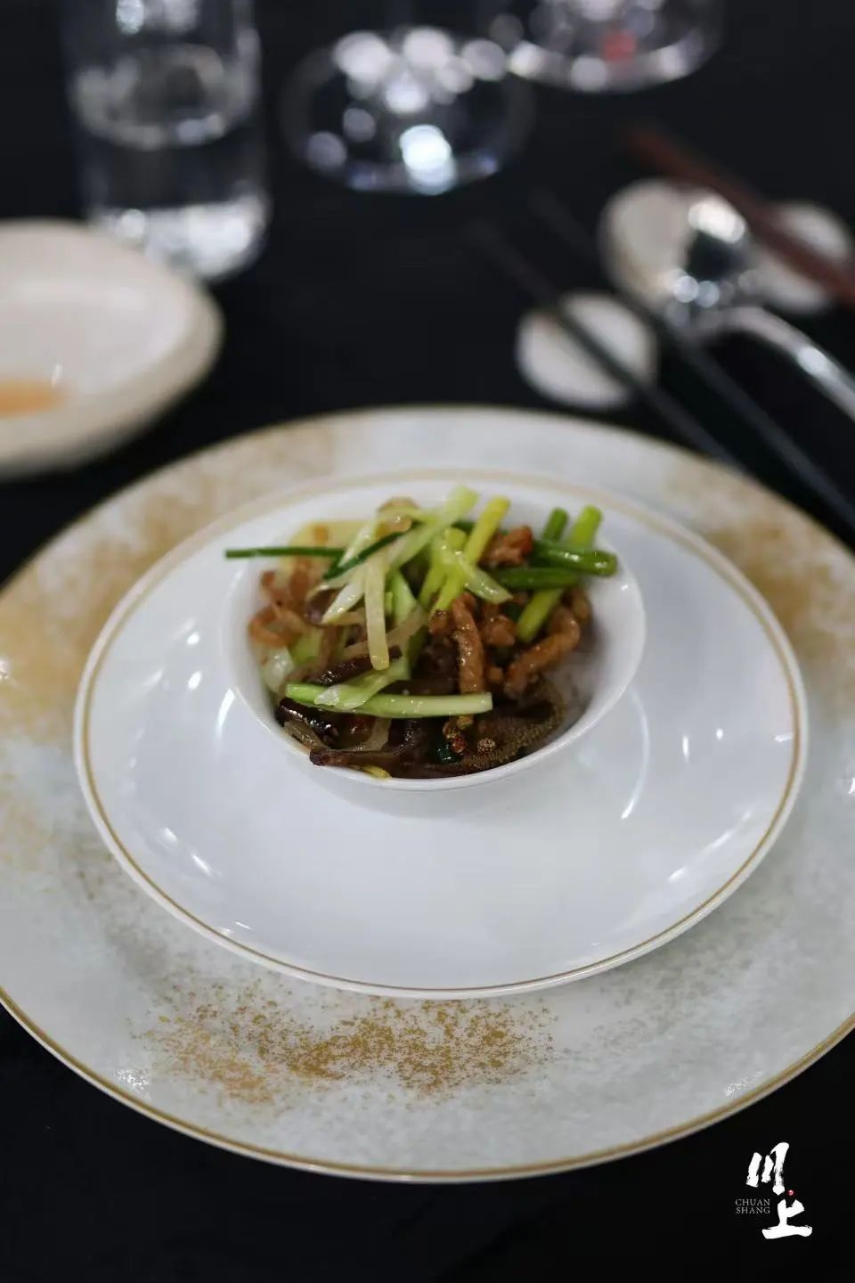 在各种品鉴晚上,以中国黄鱼做菜,已经成为某种政治正确,哪怕是在麻辣擅长的川渝地区。这道菜是用的重庆本地的酸菜,微生物的加入,带来一种地域的风味,大黄鱼只取肥嫩的鱼腹区域,现场堂灼。真正让这道菜臻于完美的,是烹调用水的讲究——选用来自挪威的VOSS天然泉水,纯粹清冽,入口柔和,以它为汤底最大程度激发食材本真的味道。这种组合只要火候到,一定很出彩,果然鱼肉嫩滑,鲜甜跃然舌尖,同时赋予酸菜更为通透的酸香,整道菜的风味更显澄澈。我们很快都吃光了盘中的黄鱼,并且意犹未尽。
